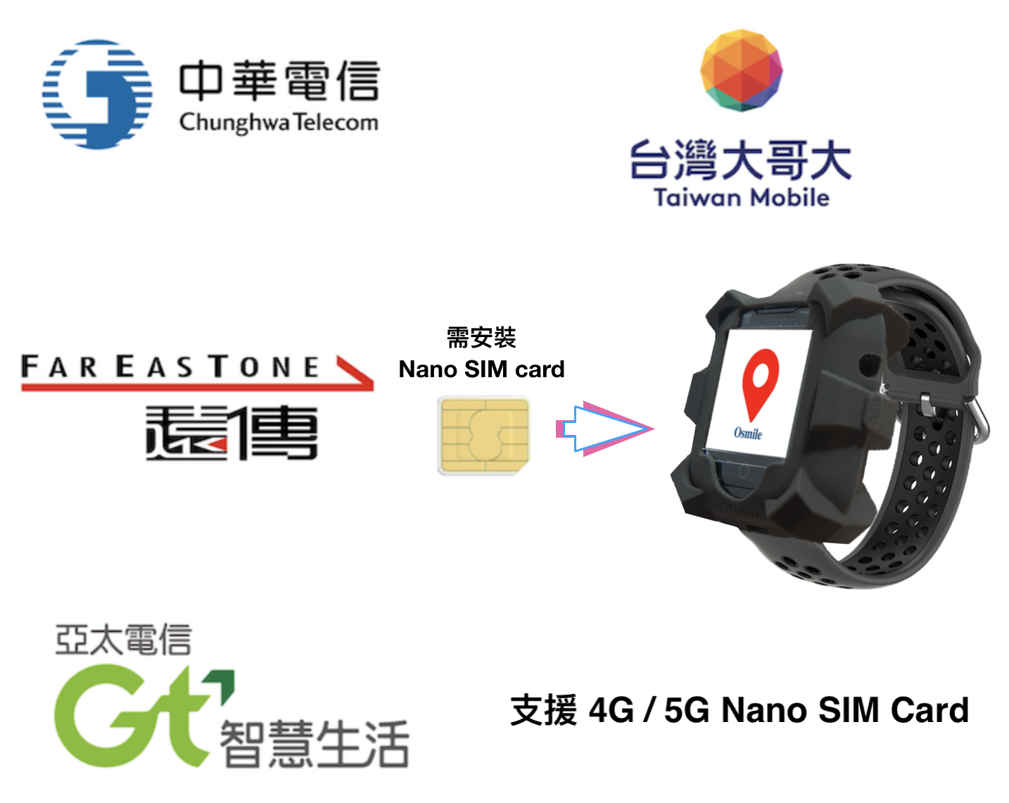 購買 Osmile ED1000 工安關懷系統定位手錶 後可至中華電信 / 台灣大哥大/ 遠傳 / 亞太 / 台灣之星 購買 (4G / 5G) Nano SIM Card 安裝後即可使用