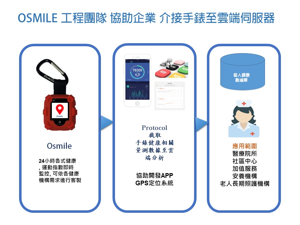 Osmile 展出的個人衛星定位器, 在 Osmile 團隊的軟硬體整合下, 包含了10大面向的產業應用:銀髮友善住宅 / 居家安全科技 / 居家緊急救援 / 跌倒偵測系統 / 環境安全偵測 / 智慧健康宅 / 高齡友善家電 / 遠距照護科技 / 智慧家電 / 智慧跌倒偵測設備。