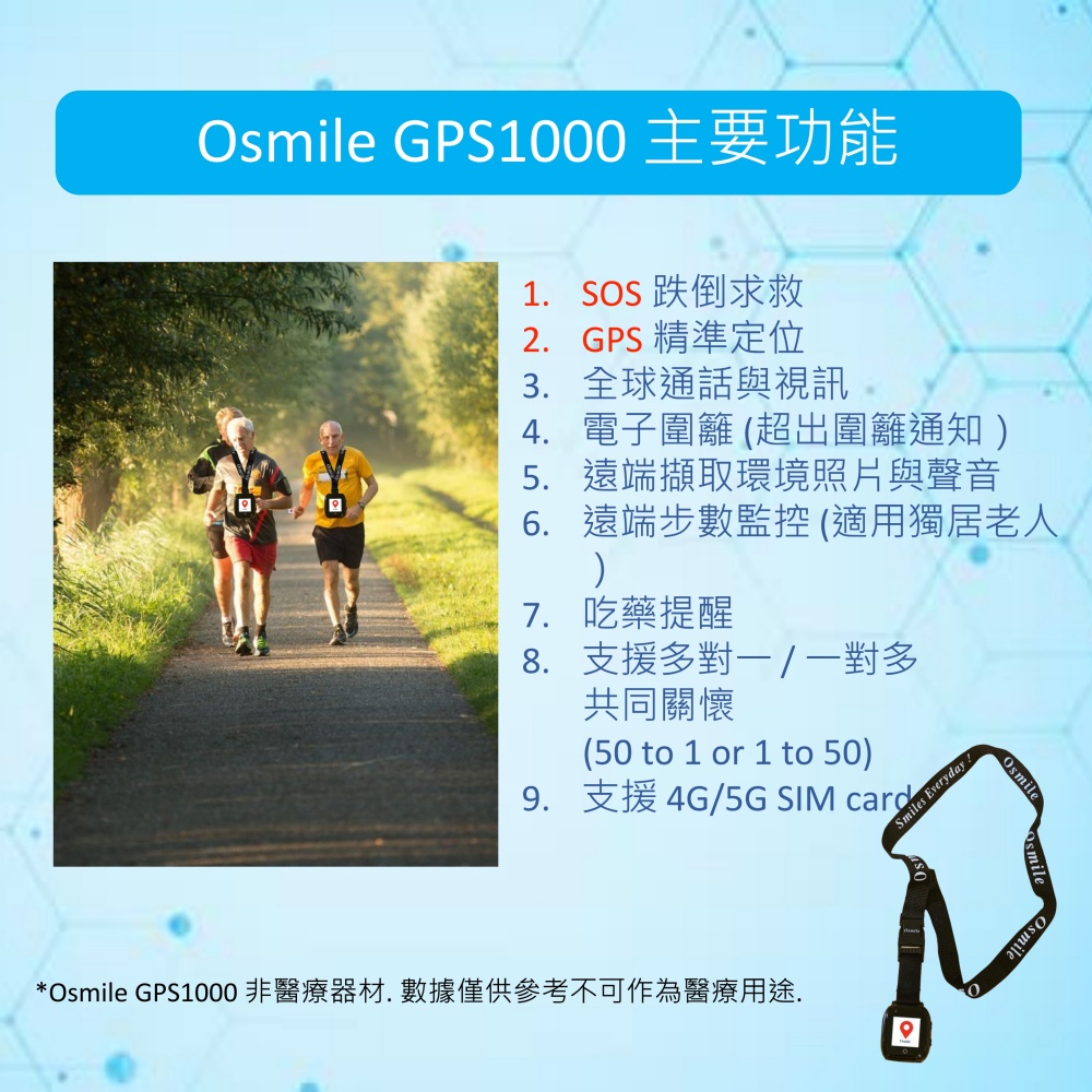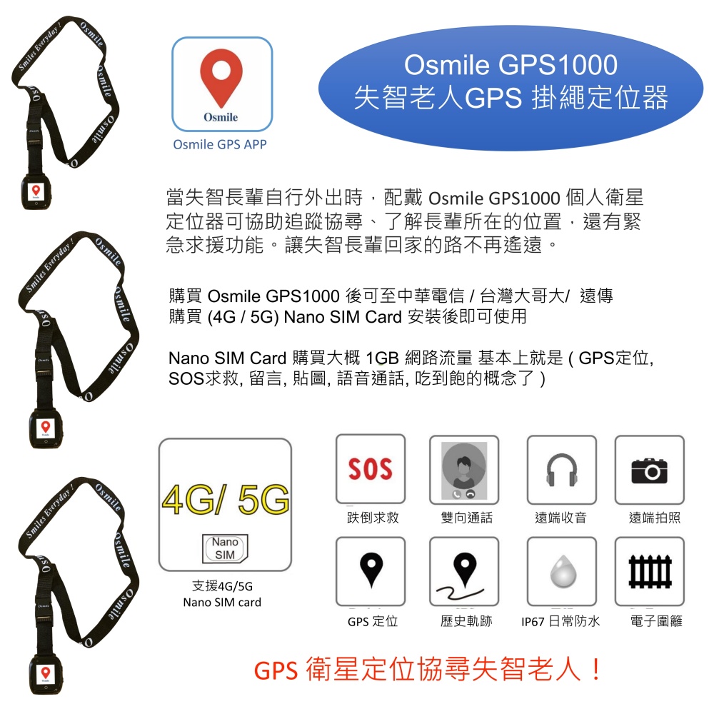 Osmile GPS1000 個人衛星定位器為協尋輔具,長者安全最主要還是需要家人負責與關心。另外 Osmile GPS1000 為充電使用裝置, 及透過4G/5G 訊號通訊, 使用者忘記充電或電信公司4G/5G 訊號無法涵蓋的範圍,都有可能造成手錶無法發揮求救通話/定位/跌倒求救的功能, 以上因素為 Osmile 公司無法掌控的風險與因素。因此Osmile 公司不負責任何穿戴Osmile GPS1000 銀髮長者走失, 跌倒或安全的相關法律責任。